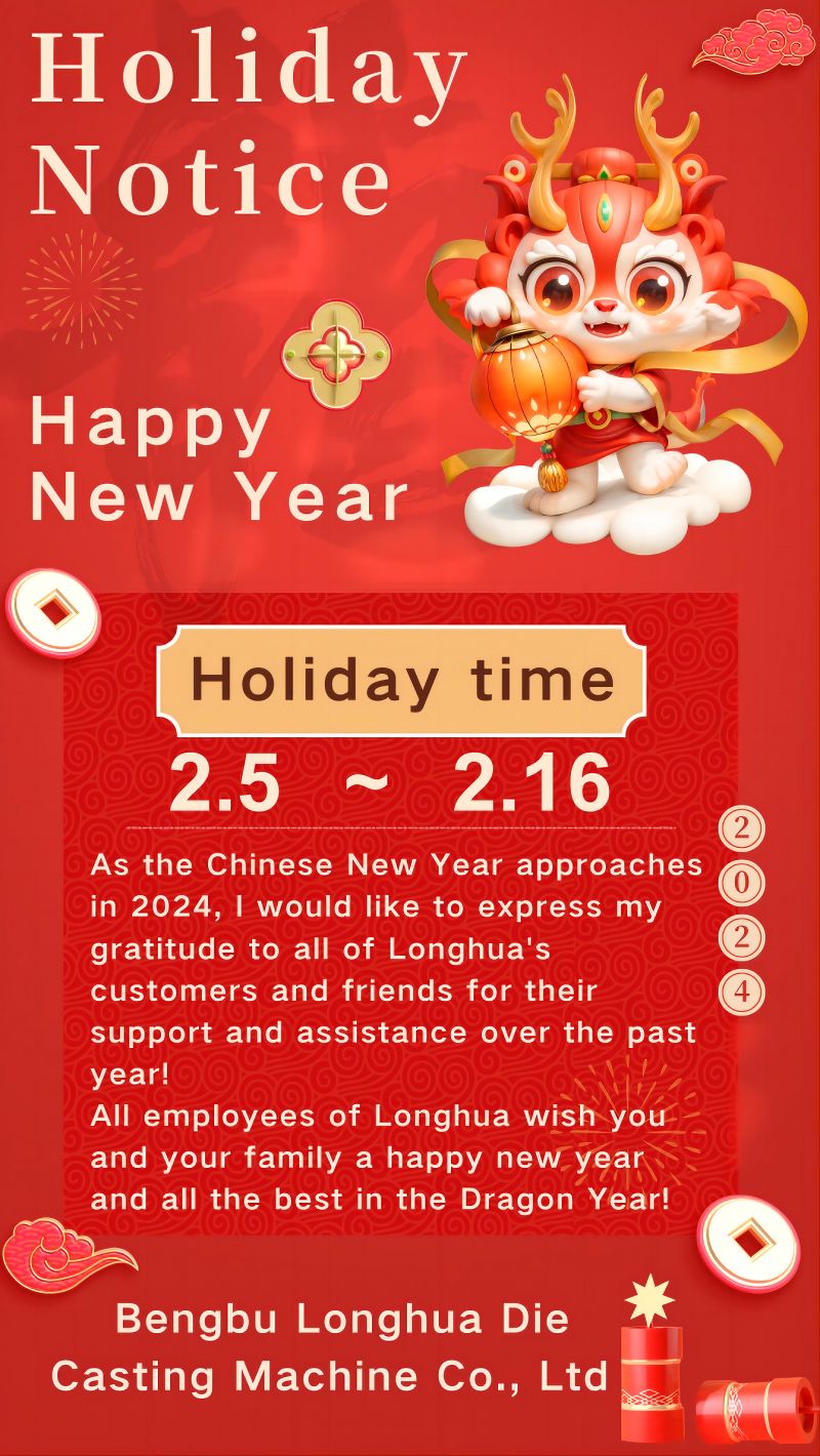 Avis de vacances du Nouvel An : Bengbu Longhua Die Casting Machine Co., Ltd. aura des vacances pour la Fête du Printemps du 2.5 au 2.16 et reprendra ses activités comme d'habitude le 2.17.